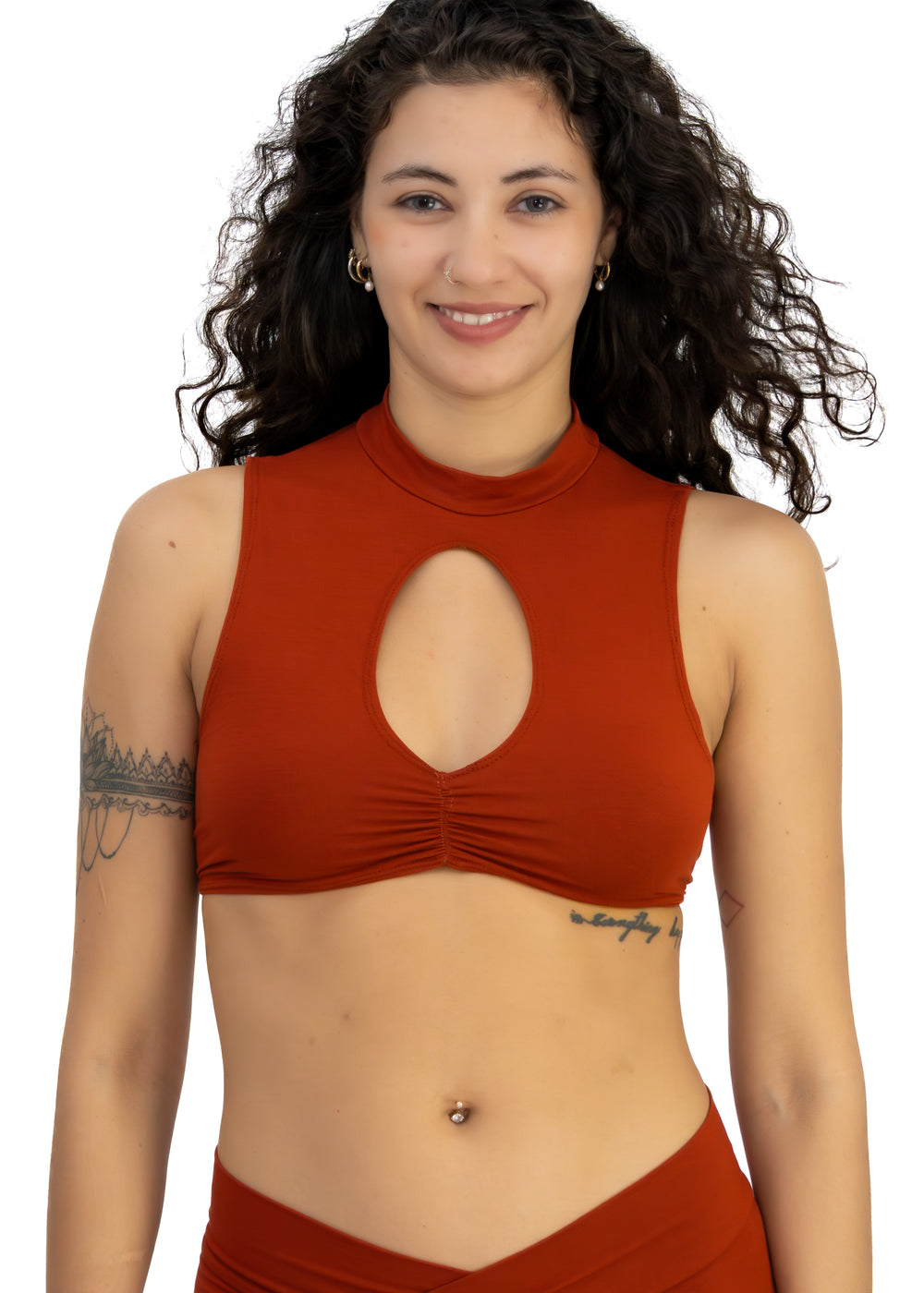 The Aurora Top is designed to turn heads with its daring keyhole front and sleek high neckline. Featuring soft ruching at the bust and a supportive band under the chest, it blends sexy and sporty in one stunning piece. Made with ultra-soft, stretch fabric that moves with your body, this crop is as comfortable as it is empowering.