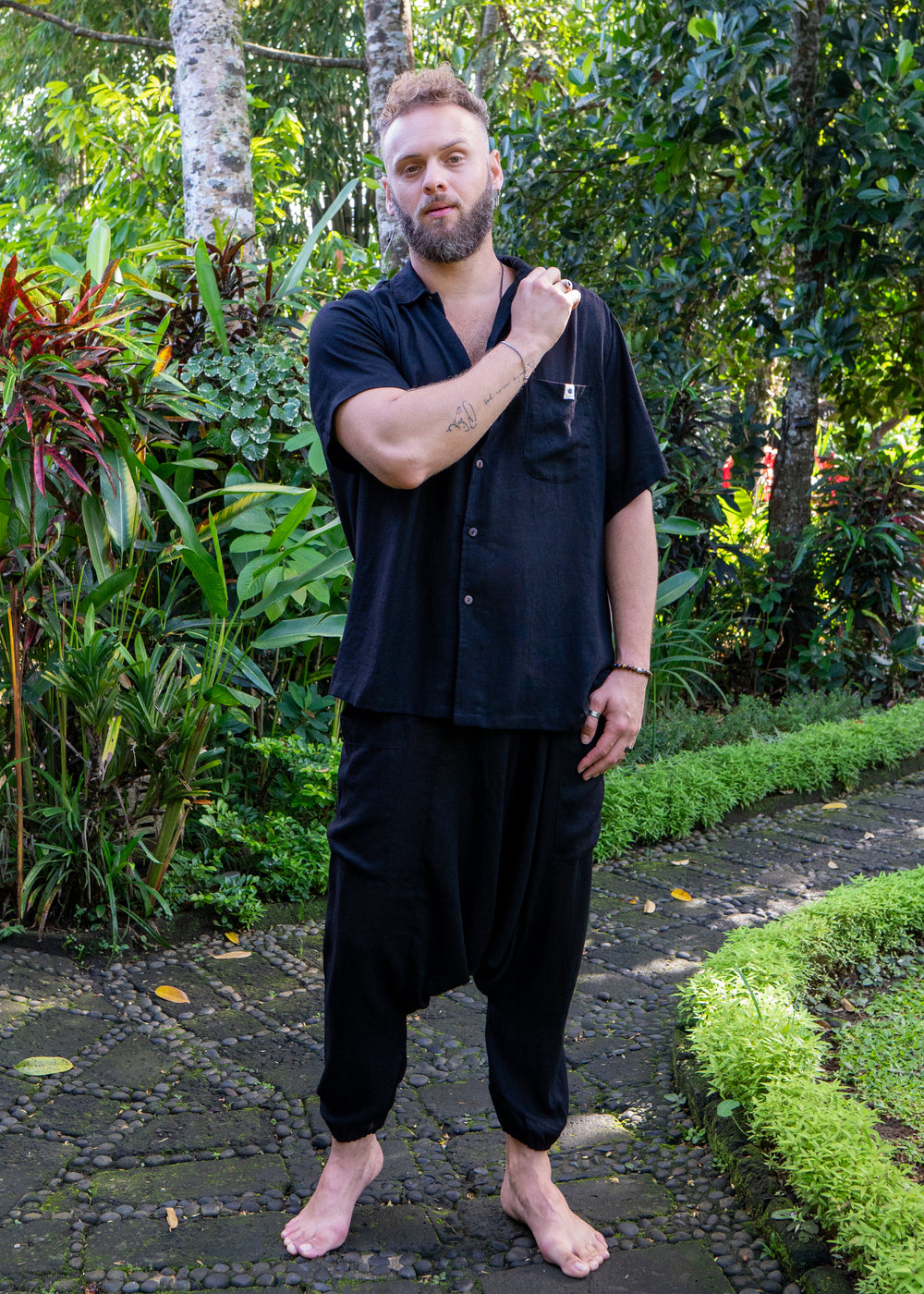 Move with intention. The DANÇAR Set in all black is crafted from lightweight, breathable linen — pairing relaxed-fit pants with a short-sleeve button-up shirt. Designed for flow, comfort, and quiet confidence, this set brings effortless rhythm to your wardrobe. Whether you’re dancing through city nights or slow Sunday mornings, it moves with you — naturally and boldly.