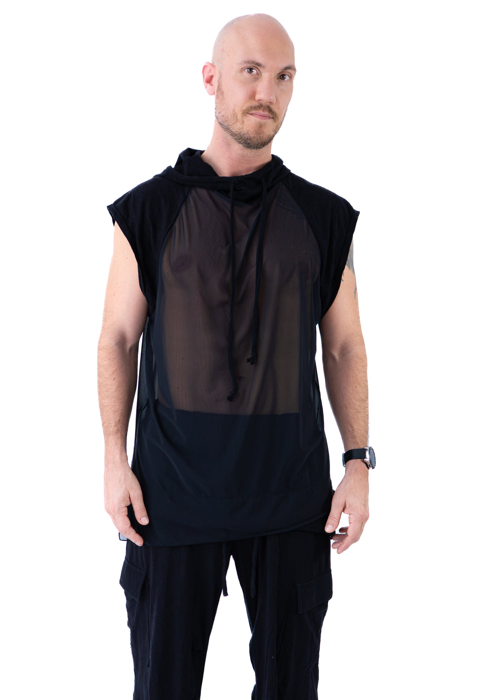 The sleeveless hoodie features a unique blend of solid and mesh fabrics, offering breathability and bold layering in one sleek silhouette.