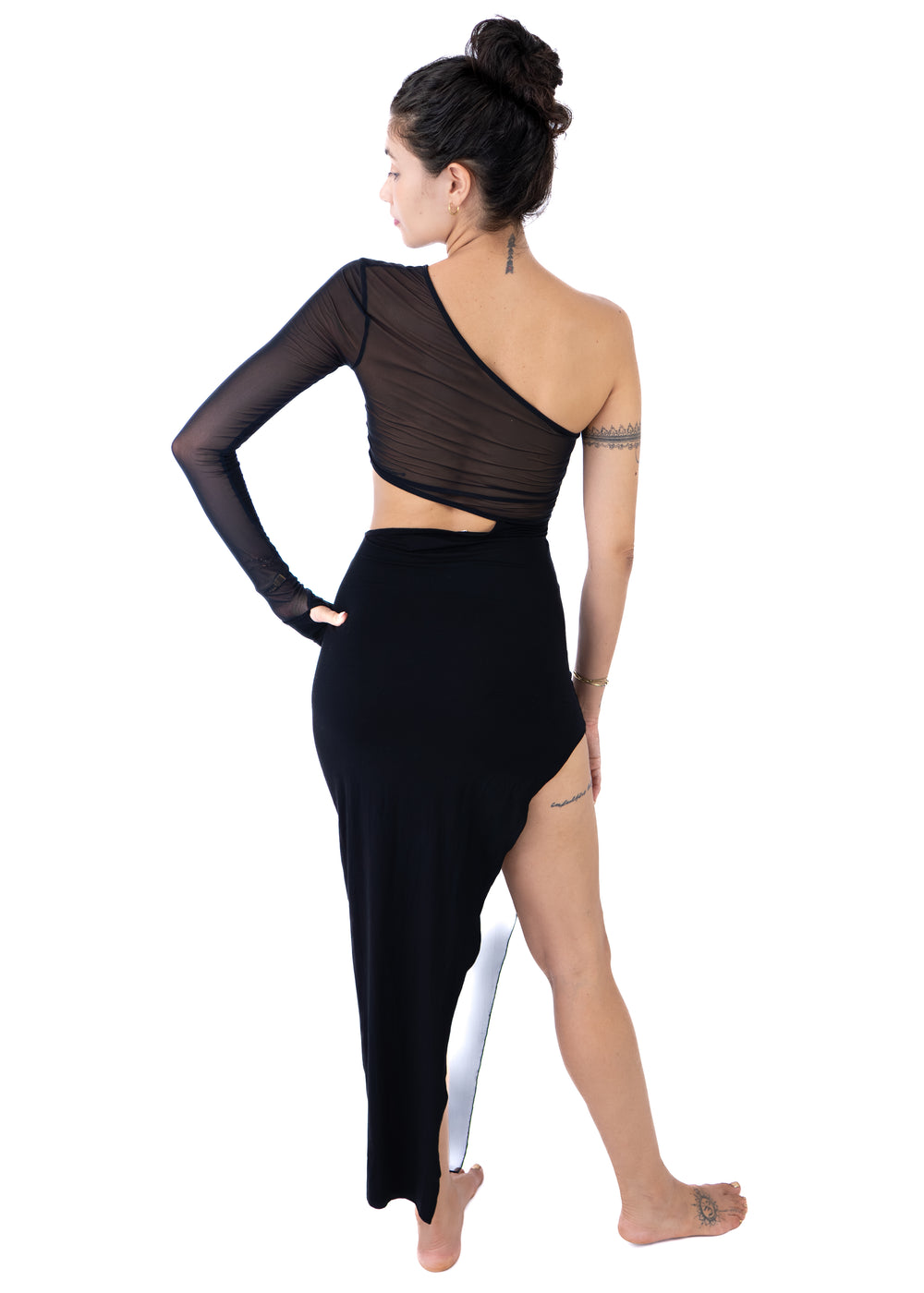 Command the night in the Isis Dress, a daring one-shoulder statement piece that channels both strength and sensuality. Featuring bold cut-outs at the waist and hip, this sleek black gown flatters your figure with asymmetrical lines and sheer mesh detailing. The long sleeve and slitted mesh skirt create balance between edge and elegance — perfect for moonlit dance floors or avant-garde occasions.